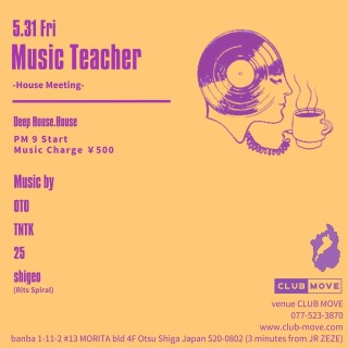この日はMOVE界隈の様々なイベントからHOUSEのDJが集います。 5/31(金) Music Teacher -House Meeting- (DEEP HOUSE,HOUSE) PM 8 OPEN PM 9 START MUSIC CHARGE¥500 (+D¥700) Music by OTO / TNTK / 25 / shigeo (Rits Spiral)