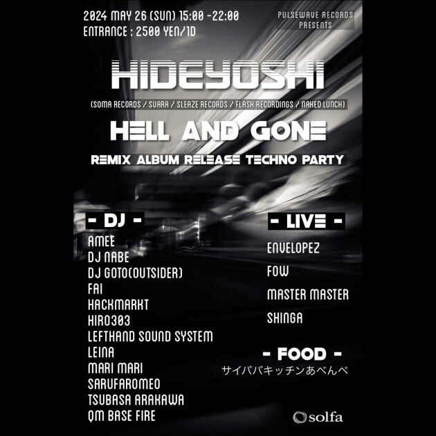 -Hideyoshi Remix Album Release Party- Venue: 中目黒solfa Date: 2024/5/26(日) 15-22時 Entrance: 2500円/1D (ディスカウント500円有り)