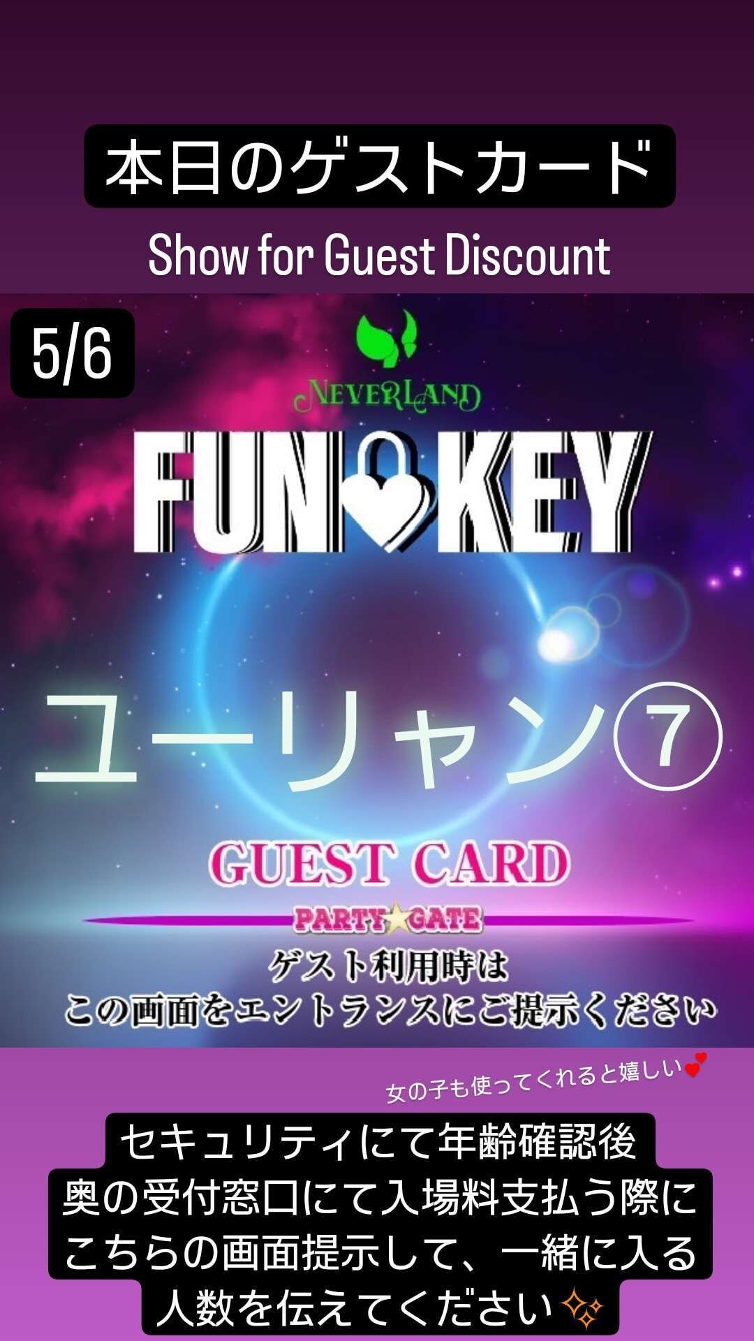 2枚目の画像はゲストカードで最安料金のディスカウントになります。また、「ユーリャン7番」と受付に伝えて頂けたらと思います。