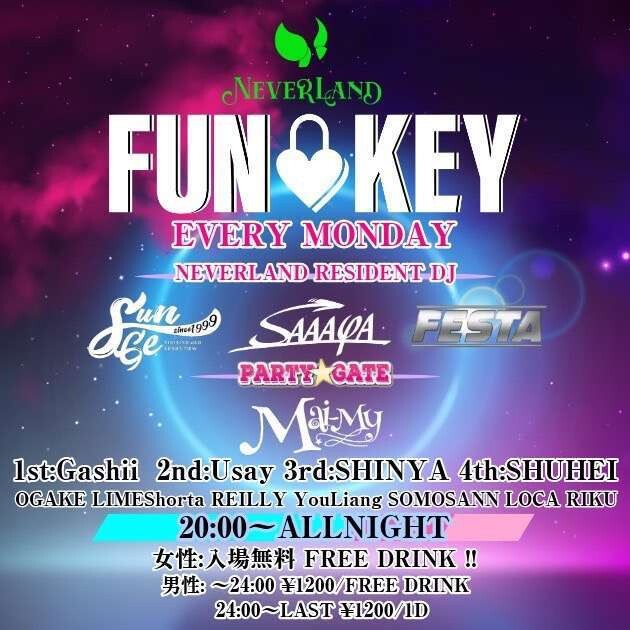 月曜日から楽しみたい人を待ち構える【FUN❤︎KEY】 がNEVERLANDに出現‼️ その扉を開ければ 最高にハッピーな空間が広がり 新旧、ジャンルを問わず最高な音に包まれる さらに月曜日はレディースナイトで 女性は終日入場無料飲み放題! 月曜日から楽しみたい人は集まれ‼️