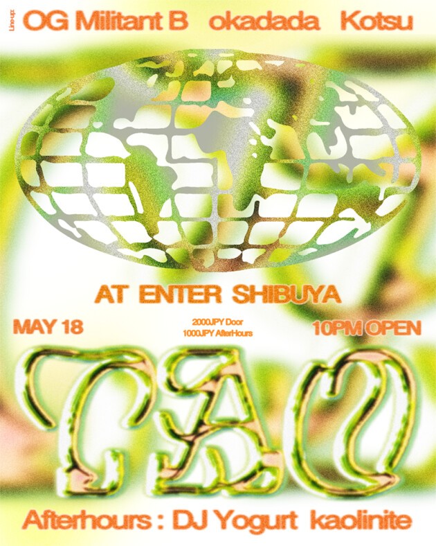 Contactで不定期週末開催していたパーティTAO。ENTERで再始動し、場所を変えての開催は5回目となる。今回はオリジナリティ溢れるディスクジョッキーがラインナップ。新宿OPENのRAGGATRON、吉祥寺CheekyのFORMATIONを主催し、圧倒的なアーカイブから生まれるラガバイブスと、数多のディスクから抽出されたドラムパターンでフロアをロックするスペシャルディスクジョッキーOG Militant Bが初登場。根底に潜むレベルミュージックへの愛と、レベルミュージックのみに留らず、次々と繰り出される洪水のようなリズムの機転はスペシャルディスクジョッキーの呼称に引けを取らない、まさしくモンスターDJ。