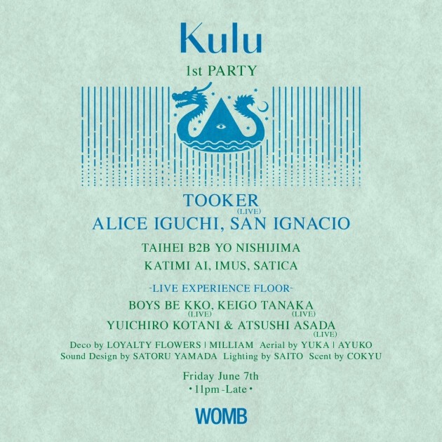 最高な音と人との出会いを求め世界中の PARTY やフェスを旅する Kulu 。そんな NEXT LEVEL の本物のパーティー Kulu の1st パーティーを、WOMB 全フロアを使って6月7日に開催。