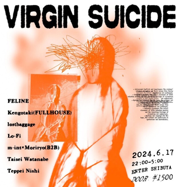 00s生まれのDJコレクティブ/パーティのHEADIGに所属し、ユースカルチャー最深部で活躍するm-intの主催パーティ、Virgin Suicide。新宿、渋谷などを拠点に暗躍する同世代のDJと、FELINE、kengotakiが名を連ねる。新鮮なラインナップで、渾身の第2回目を開催。