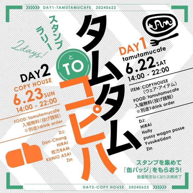 タムタムからコピハへスタンプラリー!専用のフライヤーに各店設置のスタンプを押してtamutamucafe × COPY HOUSEの『コラボ限定オリジナル缶バッジ』をゲットしよう。数量限定・無くなり次第終了です。お渡し場所は、Day2会場のCOPY HOUSEになります。 https://www.instagram.com/p/C8Ho5P4SeDz/?igsh=aHYwYm5teHc2aG9n