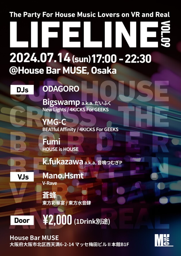 "ヴァーチャルとリアルを越境する" 関西発ハウスパーティ #Lifeline09 は7月14日(日・祝前日)大阪西天満MUSEでの開催です。