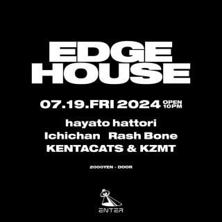 現在進行形のハウス、テックハウス、テクノを軸に五感を刺激する新感覚パーティを展開しているEDGE HOUSE。Sugar HighとのDJユニットLucichiでの活動やパーティDEPARTURESの開催など、ソロ、ユニット共に活躍の場を広げるichichan、都内各所のクラブで活躍し、徐々にその頭角を現すRash Bone、名古屋を拠点に活動する4MC、デザイナー、DJ、モデルで構成されたクリエイティヴクルーL.O.S.Tのメンバーhayato hattoriと、アップカミングなアーティストを招く。プロデューサー、トラックメイカーとしても精力的に活動しているEDGE HOUSEの主要レジデントKENTACATSとKZMTが要となり、ENTER SHIBUYAにてEDGE HOUSEを初開催する。