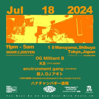 asia THURSDAYに新たなコラボレーションライン"PICNIC"がスタート。初回はDJユニットハナチャンバギー速報をホストに迎え、若手から実力派まで個性溢れるDJたちがclubasiaに集う。"ムンムン"をキーワードに熱量MAX、夏の熱い一夜を作り上げる。