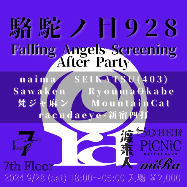 【駱駝ノ目 928】*7th FLOOR 渋谷 《 Falling Angels Screening After Party 》 2024 8/28 (sat) 18:00〜5:00 Entrance ¥2,000- @savefallingangels 木村ナイマ監督