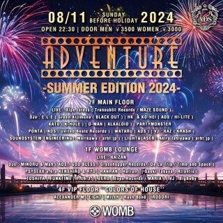 WOMB を中心に野外パーティー等も開催し毎度超満員で大盛り上がりを見せる ADVENTURE が8/11(日/祝前日)-SUMMER EDITION-と題し、DJ mag TOP 100 CLUB's ランキングで長年日本の TOP を走り続ける国内最高峰クラブ渋谷 WOMB 全フロアで開催決定!