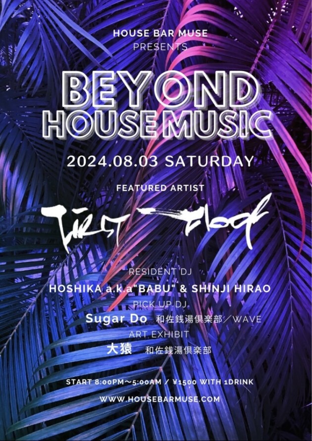 On Saturday, August 3, 2024, BEYOND will be a fusion of music and art. The second appearance of track maker and DJ "First floor," who will appear for the second time in a year, will be joined by vinyl junkie "Sugar Do," who is expanding his activities in Osaka as a pickup dj, and up-and-coming artist "OZARU," who will present a powerful art exhibition. Please come and experience it for yourself.
