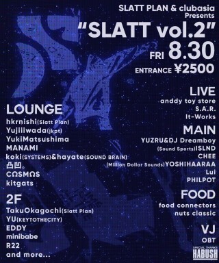 ラウンジフロアではSLATT PLANメンバーと日頃より親交の深いYujiiiwada(jkpt)、YukiMatsushima、MANAMIらと共に、レギュラー出演となる凸凹。、koki(SYSTEMS)×hayate(Sound Brain)らがBtoBでの共演となる。