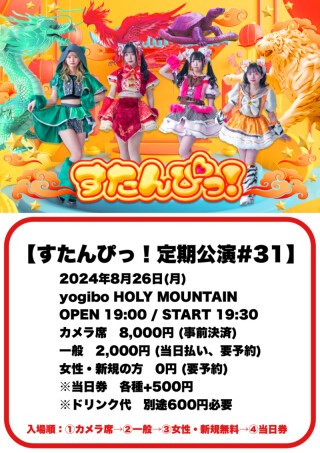 すたんぴっ! https://tiget.net/events/333272 カメラ席 ¥8,000(事前決済) 一般¥2,000(当日払い、要予約) 女性・新規の方 ¥0(要予約) 当日券 各種+¥500 ※ドリンク代 別途¥600必要 オールスタンディング 整理番号順入場(カメラ席→一般→女性・新規無料→当日券)