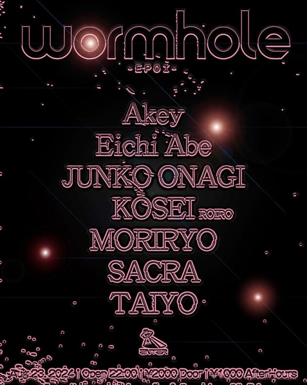 新パーティ WORMHOLE が始動。記念すべき初回には、エッジィかつディープなテクノセット〜ブレイクス・レフトフィールドテクノ・エレクトロを網羅したオルタナティブな双方のプレイスタイルを軸に、規模に関わらずクラブからフェスまで数多の現場をこなすAkey、アジア、ヨーロッパツアーを敢行中のトランスパーティクルーみんなのきもちの一員として、国内外共に経験値を積み、個人でも様々な現場に出演しているEichi Abe、バッグデザイナー、PR、キャスティング、インフルエンサーとして、多岐に渡り長期的に活躍し、様々なメディアやウェブサイト、ファッション誌、ビューティーモデルとして活躍中の、Junko Onagi、新鋭レーベル〈ROIRO〉をGolpe Mortal、the2$と主宰し、ハードミニマルを中心にしたポッピンなハードグルーヴで、都内アンダーグラウンドパーティへ出演しているKOSEI、テクノコレクティブ兼パーティRAVAGEのメンバーとしてとして活動中のMORIRYO、幼少の頃よりバレエダンサーとして数々のアワード受賞経験を持ち、その表現力を音楽と共に昇華させ、東京を拠点にアジアやヨーロッパ、国外でも多くのオファーを得ているSACRA、渋谷を中心に活躍場所を徐々に広げているTAIYOと、エナジーに満ちた刺激的なラインナップが揃った。