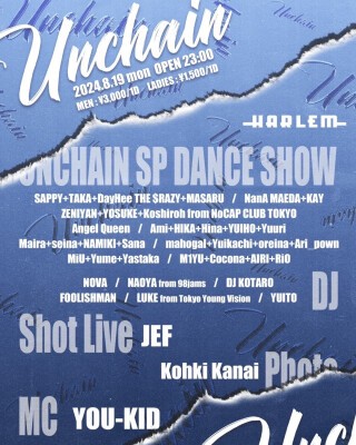 UNCHAIN SP DANCE SHOW: SAPPY+TAKA+DayHee THE $RAZY+MASARU, NanA MAEDA+KAY, ZENIYAN+YOSUKE+Koshiroh from NoCAP CLUB TOKYO, Angel Queen, Ami+HIKA+Hina+YUIHO+Yuuri, Maira+seina+NAMIKI+sena, mahogal+Yuikachi+oreina+Ari_pown, MiU+Yume+Yastaka, M1YU+Cocona+AIRI+RiO