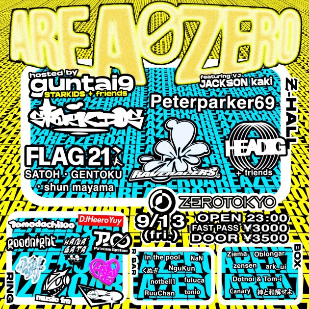 STARKIDS率いるレーベル・guntai9がホストする東京のナイトカルチャーを彩るクルー、パーティー、アーティストが一堂に会するイベント”AREA ZERO”。4回目の開催となる今回もPeterParker69やSATOHが率いるコレクティブ・FLAG21、Rave Racersの出演が発表された。