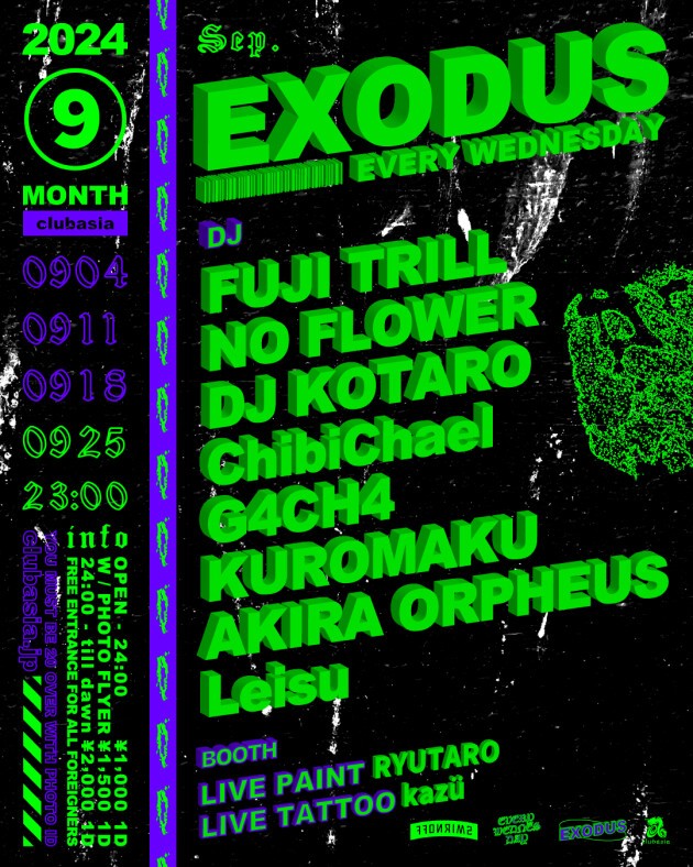 ✺ FUJI TRILLをはじめ多方面に活躍するDJ , BeatMakerが毎週水曜の渋谷の夜をにぎわす通称 " #エクソ "。LIVE PAINT, LIVE TATTOO, EXHIBITIONも隔週でcheck。