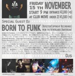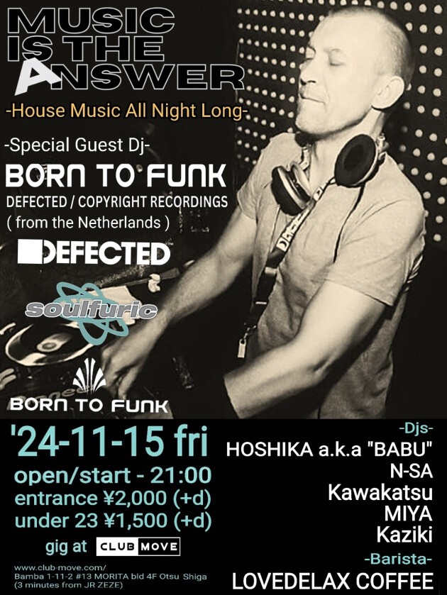 11月の "MUSIC IS THE ANSWER" はスペシャルゲストDJにオランダはアムステルダムより "BORN TO FUNK" が登場!! "Defected" や "Soulfuric" 等をはじめ、"Plus 8" 等といった名門レーベルより良質な音源をリリース。ワールドワイドなツアー等も精力的に展開し世界中のダンスフロアに感動と熱狂をもたらすプレイを是非、体験して欲しい。迎える日本勢は大阪を拠点とし、幅広い年齢層に支持されているHoshika a.k.a BABUを筆頭に、MOVE界隈の様々なパーティーからN-SA、Kawakatsu、MIYA、Kazikiが参加。