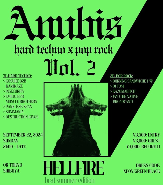 BRAT SUMMER はまだ終わらない! ANUBIS Vol.2: HELLFIRE が2024年9月22日午後9時からOR宮下公園で開催される。ハード・テクノとポップ・ロックを2つのフロアで楽しめるこのイベントには、それぞれの音楽シーンで日本で人気のDJが勢揃いする。