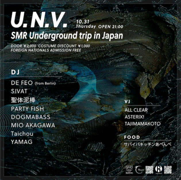 UDAGAWA NIGHT VOICE (U.N.V.) and SMR Underground Trip, a party from Berlin that has been held in various places around the world, will hold their first ever Japan performance as a special collaboration party on Halloween, October 31, 2024! The main guest will be De Feo, founder of the label SMR Underground, which is originally from Italy and is now based in Berlin. SMR Underground has released works by famous artists such as Alex Bau and YellowHeads, as well as cutting-edge underground artists such as N.O.B.A and Shadym, and their released works have been dropped by Joris Voorn at Awakenings, and have also made it into the Top 10 on the Beatport Hard Techno annual label chart many times. This time, label mates DOGMABASS and MIO AKAGAWA will be joined by PARTY FISH, a hard-style leader in the Japanese scene, A DJ who manipulates sound freely 生体泥棒, DJ SIVAT, who has a wide selection and mixing vocabulary and is a member of the French label Square Lab, TAICHOU, who sends out techno from his body, and many other diverse DJs, as well as three gorgeous VJs for Visual Effect. The techno party at R Lounge on October 31, 2024 will be a historic one.