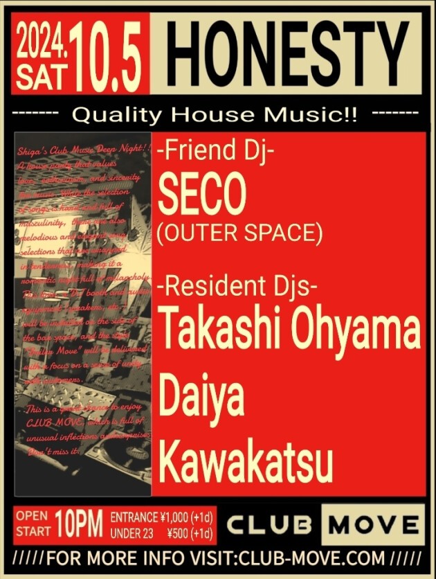 This time, we will invite "SECO", who is a resident with NOBU and HAYASE at the Kyoto house party "OUTER SPACE", which continues to be loved by deep house fans, and continues to lead many nights where Kansai music lovers gather. The exquisite melody that seems to coexist with moist beauty and melancholy is intertwined in the heavy bottom that spreads throughout the space. Please enjoy such a dense DJ play.