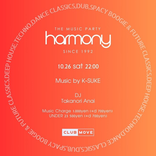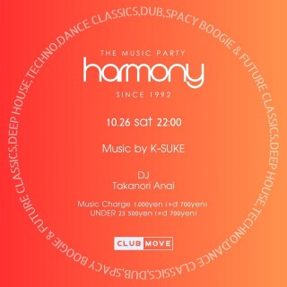 In October, HARMONY will be a long-awaited duo of K-SUKE and Takanori Anai. We hope you will enjoy the musical perspective of one DJ at a time.
