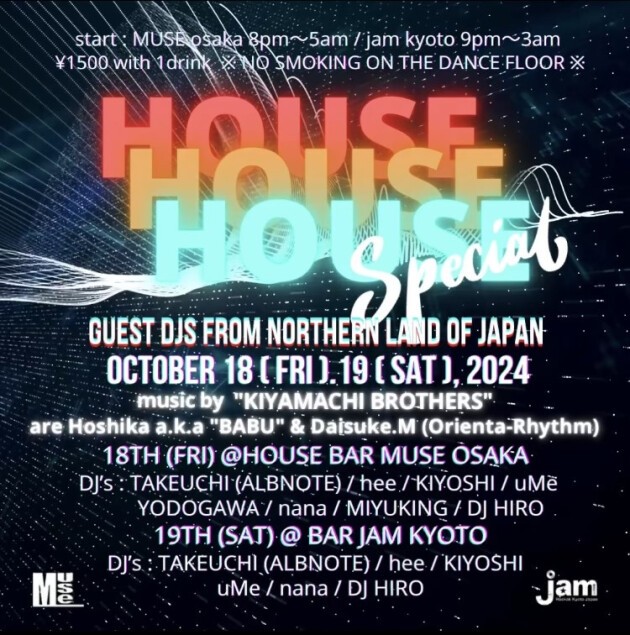 18TH (FRI) @HOUSE BAR MUSE OSAKA DJ'S TAKEUCHI (ALBNOTE) / hee / KIYOSHI / uMe YODOGAWA/ nana / MIYUKING / DJ HIRO