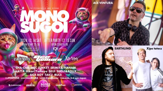 ageHaの元プロデューサーにして、OZORA TokyoのオーガナイザーDANCE ON THE PLANETが世界のトップランナーを紹介するパーティー、その名も「MONOSUGOI =モノスゴイ」開催決定!! 初回のゲストは、サイトランスシーンの真の王者・ACE VENTURAが、2019年ageHaのアニバーサリー以来、実に5年ぶりの来日を果たす。更に、毎回想像を超えるセットでフロアを沸かし、熱烈な人気と実力を誇るEARTHLINGも来日。世界のサイトランスシーンの最前線 を感じさせる強力なマッチアップが実現。加えて、ここ数年南米を中心に引っ張りだこ、世界レベルの人気デュオとなったXipe totecs (シペトテクス)が、彼らにとっても激レアな90分のオープニングセットを披露。サブフロアはGreen Magic、そしてAKACHOCHINがオーガナイズし、メインにも負けない熱気あふれるフロアをプロデュース。更にR-LOUNGEで開催するアフターパーティーまで完璧なラインナップが用意されている。そして5年ぶりのACE VENTURA