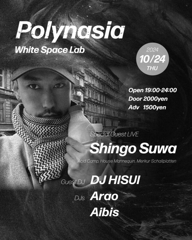 10月のPolynasiaは、ベルリン/ポーランドから一時帰国する世界的著名なDJ/Track MakerのShingo Suwaを再び招致。今年5月以来の日本帰国後、第1発目の出演として渋谷のWhite Space LabにてLIVEセットを披露。サポートは、東北~都内各地において野外フェスも含め鋭意活躍中のDJ HISUIが担当。