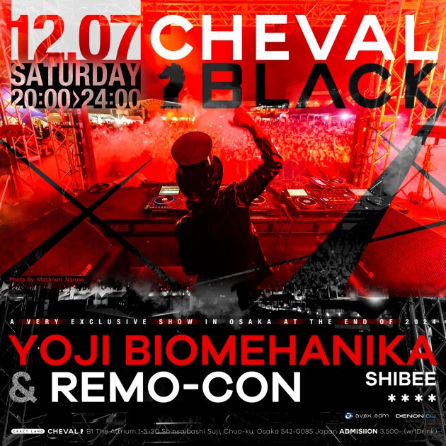 日本が世界に誇るレジェンド、ハードダンス/ハードトランスの帝王「YOJI BIOMEHANIKA」と、氏の盟友にして最先端のハードグルーヴサウンドを司るダンスクリエイター/DJ、「REMO-CON」が贈る、大阪エクスクルーシブな一夜 <CHEVAL BLΛCK> が実現!