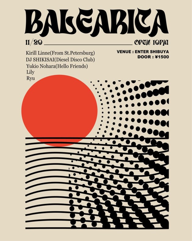 サンクトペテルブルクよりKrill Linneを招聘。国内アーティストにフォーカスして数多のダンスチューンをリリースしている国内有力ディスコレーベル〈Diesel Disco Club〉主宰のDJ SHIKISAIを筆頭に、同レーベルよりEPをリリースしたYukio Nohara、2023年にインドネシアツアーを、今年にはソウル、フィリピン、タイを回るアジアツアーを敢行したRyu、ヴィンテージレコードショップELLA RECORDS所属Lilyが共演。
