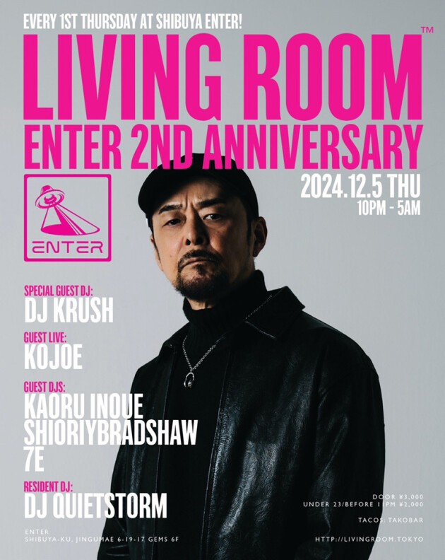 ヒップホップ/ハウス/ジャズに限らず、様々な手法で独自の音楽を提示し続けた真の音楽家であるDJ QUIETSTORM。彼だからこそ為し得ることのできる特別な一夜にはこれまで、平日のパーティにも関わらず様々なジャンルのトップDJ/アーティストだけでなく、これからの音楽を担う若いアーティストを招き、音楽を愛する多くの人々を魅了してきた。 代官山UNICE→渋谷contactを経て、2023年渋谷ENTERで再始動。今年5月にはLIVING ROOM™の10th Anniversaryが開催され、さらに渋谷ENTERでの開催が20回目を迎える今回、ENTER 2nd Anniversary editionとしてヒップホップシーンを牽引し続けるレジェンドであり先鋭かつトップを歩み続けるアーティストを招き入れる。
