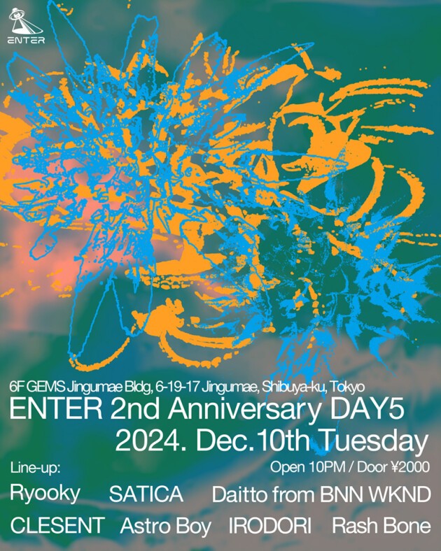 2022年12月15日にオープンしたENTER SHIBUYA。この度、2周年を祝した2週間に及ぶ9日間のアニバーサリーパーティを開催する。記念すべきDAY5は、テックハウス、ミニマルテックを得意とする面々が揃った。サイトランス、テクノ、ヒップホップライブなど、数多のアーティストを招集してきた野外イベントMeetingPointFestivalをオーガナイズし、ENTERではHEADSを主催するRyooky、イビサのビッグフェスティバルや大型クラブからDragon Ashのkenkenのパーティへの出演など多岐にわたるバイタリティを持つTakuto Uchiyamaと、ブラックミュージックをルーツにヒップホップの楽曲制作を行い、さらにトランスDJのキャリアを持つSHOGOによって構成されるDJプロジェクトSATICA、ENTERで開催されているテックハウス、ミニマルテックパーティondalocaのレジデントを務めるBNN WKNDのDaitto、Clesent、主催OptionalをENTERで開催中のAstro Boy、ハウス、テックハウスを軸に彩り豊かな音色でフロアを彩るIRODORI、今年7月にREVENGEを主催、Astro Boyも所属する東京拠点の若手DJで構成されたDJクルーTERACOTTAのメンバーRash Boneが出演する。
