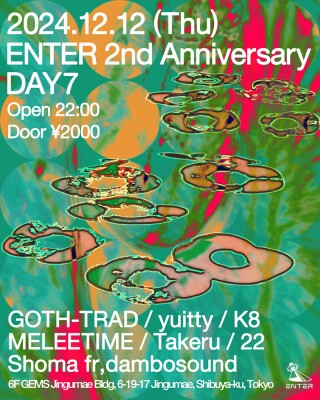 2022年12月15日にオープンしたENTER SHIBUYA。この度、2周年を祝した2週間に及ぶ9日間のアニバーサリーパーティを開催する。記念すべきDAY7は、ダブステップ、ベースミュージックシーンの最重要パーティBack To Chillの主宰Goth-Tradを筆頭に、グライム、ガラージ、ベースミュージックプレイヤーが集結。DiVANG TUNE主催のyuitty、ExpresseurのHarutoと共に開始したonomatopeを皮切りに、ENTERにて単独主催Buzzinを始動したTakeru、言わずもがなのゴムクルーTYO GQOMの最年少メンバー、アフロハウスやアフロビーツ、シンゲリ、はたまたダンスミュージックまで多くのアーカイブから繰り出す卓越したミックススキルで活躍するK8、クィアフレンドリーパーティMASALAをオーガナイズし、能動的でジャンルレスなパワフルプレイに定評があるMELEETIME、11月21日、レジェンドディスクジョッキーDJ RIDEとDJ KENTAROを自身主催Command+に招いたShoma ft. dumbosound、東京拠点若手DJで構成されたDJクルーTERACOTTAのメンバーであり、ダンスホール、アフロビーツパーティBangerを主催する22が出演する。留まるところを知らぬ轟音が鳴り響くフロアで、低音を体感してほしい。
