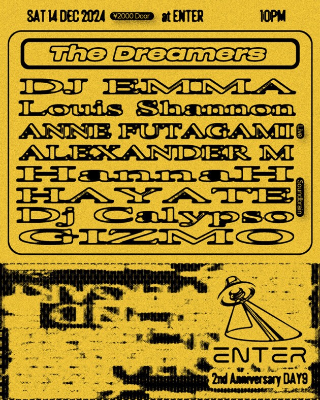 2022年12月15日にオープンしたENTER SHIBUYA。この度、2周年を祝した2週間に及ぶ9日間のアニバーサリーパーティを開催する。記念すべきDAY9はミックスCDの金字塔、「EMMA HOUSE」を19枚リリースし、未だなお最前線で活躍するKing of HouseことDJ EMMAを筆頭にハウスミュージックの使者たちが集結。唯一無二のプレイスタイルで徐々に活躍場所を広げるANNE FUTAGAMIがライブセットを披露し、テクノ、テックハウス、エレクトロ等ジャンルの枠を超えるボーダーレスな選曲とテクニカルなグルーヴで、兄RICKEYとのユニットShannon Brothersとしても活躍するLouis Shannon、渋谷、六本木を拠点に活動を開始、ヨーロッパのクラブシーンにインスパイアされたテックハウス、ミニマルテクノ、メロディックテクノなどをブレンドしていくAlexander Murakami、ENTERにてゲストを迎える不定期平日パーティWith GIZMOをオーガナイズするwarai_motokoとUGによるスニッフィングミュージックデュオGIZMO、新宿Disco Devilの店主であり、ENTER第2、4土曜日アフターアワーズレジデントのHannaH、Sound BrainのHAYATE、グラフィックライター、ファッションデザインなどクリエイティブに活動するDj Calypsoが出演する。ENTERにて多様な夜を演出してきた面々がここ、渋谷ENTERにて再合流し、1周年を迎えるまでの道程、またこれから生まれる新たな夜への期待を胸に、ENTER 2nd Anniversaryの集大成を華やかに飾る。