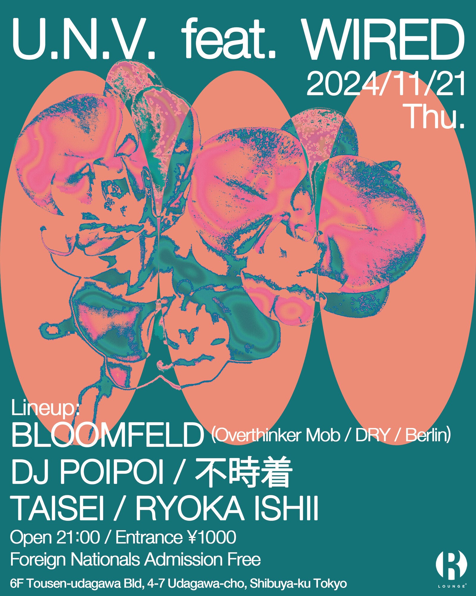 サポートラインナップには、イギリスの名門レーベル NIGHT SLUGSで務めた経験をもつDJ POIPOIのモダンエレクトロニックや、幼少期から色々な楽器に触れてきたDJ 不時着のサイケデリックでカラフルな世界。WIREDをオーガナイズする、RYOKA ISHIIとTAISEIといった、Bloomfeldと共鳴する先鋭的な音を持ち味にする才能が揃った。