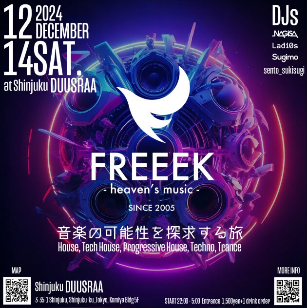FREEEK - heaven's music は、新譜を中心としたハウスミュージックを軸に、ダークで深いサウンドから美しいメロディアスな楽曲まで、幅広い選曲で一晩中楽しめるパーティーです。