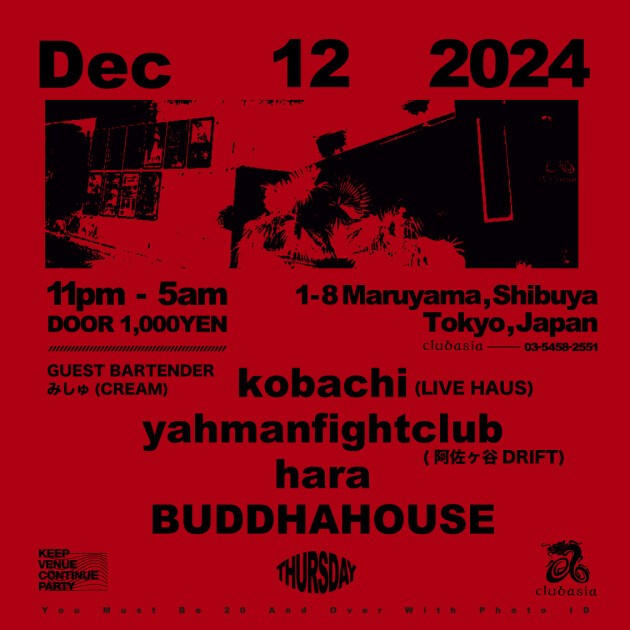 ✸ BUDDHAHOUSE and Hara, the two resident DJs of clubasia's "THU" held every second Thursday, bring you a special year-end party this month!