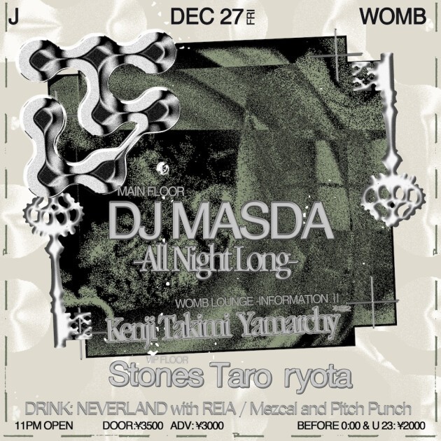 自身のレーベル Cabaret Recordings とともに世界的な信頼と認知を得ている Berlin 在住の日本人 アーティスト である dj masda がキュレーションする、「ONE DJ」、「ALL NIGHT LONG」、「VINYL ONLY」に重きを置いたパーティー J。3回目の開催となる今回は、J の発起人 dj masda が WOMBでは 初となる OPEN TO LAST で登場!