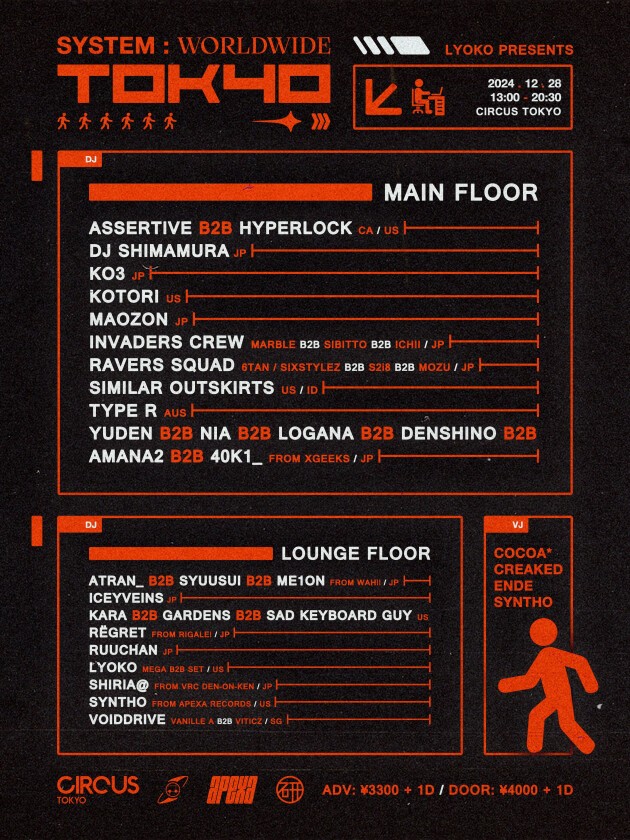 LYOKO & friends are taking over CIRCUS TOKYO for an unforgettable event! Experience the second iteration of SYSTEM: WORLDWIDE with dynamic group takeovers and world-class artists. Presented by LYOKO, APEXA RECORDS, and VRC DEN-ON-KEN.