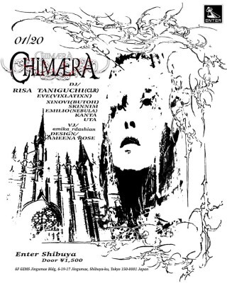 CHIMÆRAは新たなテクノシーンの構築と、東京のテクノシーンの促進を図ります。私達は、解放的で、一切のストレスのない空間であるパーティをすべての人の為に作ります。今回は、東京で注目を集めるアーティストや、国内外でシーンを牽引し、活躍する DJ達と一緒にクリエイティヴなテクノ空間を作り上げます。