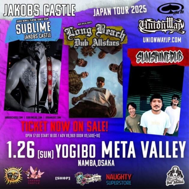 【ACTS】 JAOKOBS CASTLE / Long Beach Dub Allstars / SUNSHINE DUB 【SHOP】 BALL&CHAIN / NAUGHTY SUPERSTORE 【TICKETS】 一般発売中! •イープラス https://eplus.jp/sf/detail/4230690001-P0030001 •ローソンチケット https://l-tike.com/order/?gLcode=72789