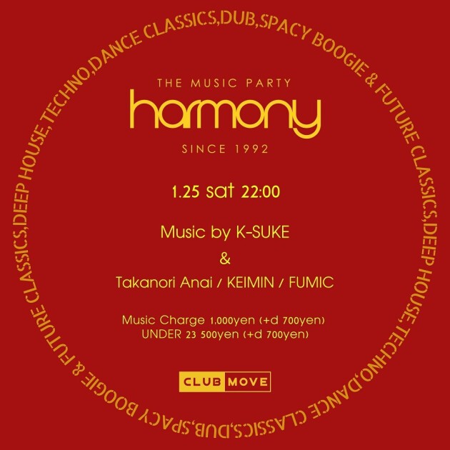新年最初のHARMONYは、関西の新星大学生DJ達によるパーティー "Scramble" の中心メンバーで "関西大学レコード音楽部" の "Keimin" と "FUMiC" にサポートDJを託し、今最も旬で勢いのある若手2人のHouseやDiscoの世界観を表現してもらいます。