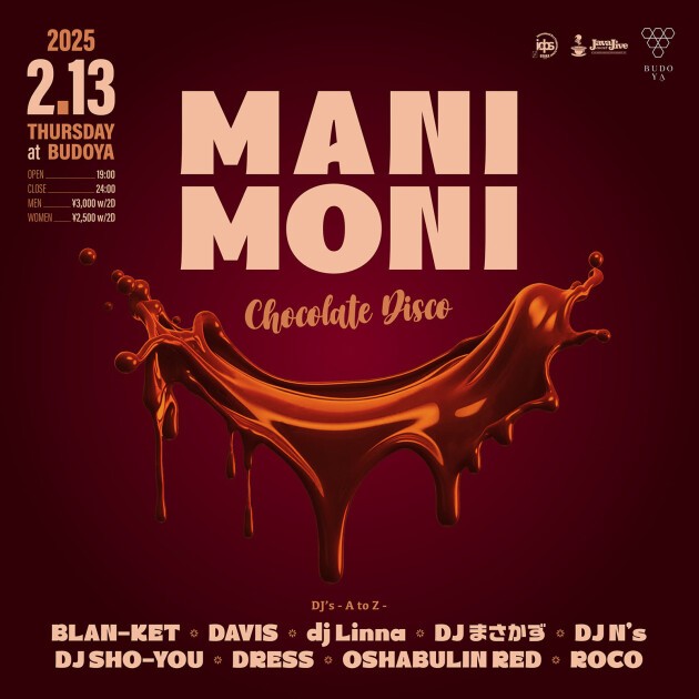 On Thursday 13th February, MANI MONI's Valentine's Day special "Chocolate Disco" will be held at Umeda BUDOYA OSAKA from 7pm.