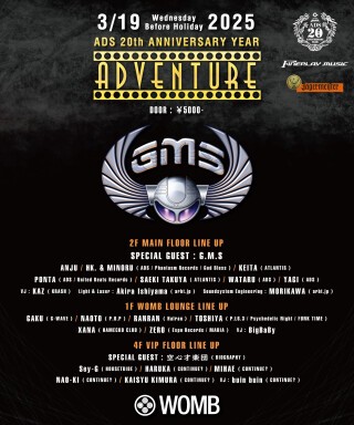 WOMB を中心に野外パーティー等も開催し毎度超満員で大盛り上がりを見せる ADVENTURE が3/19(水・祝前日) に、 今年 ADS 20周年を記念し-ADS 20th Anniversary Year-として長年アンダーグランドシーンにて日本のTOPを走り続ける国内最高峰クラブ WOMB 全フロアで開催決定。