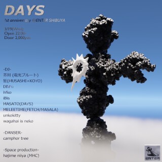 毎度お騒がせしております、DAYSです! 1st anniversaryとなる今回、信頼を置いているいつものお馴染みなメンバーに加えて、期待のニューウェーブのh!ko、iBis、空間を演出してくれるクリエイターhajime niiya、盛り上げ番長の問題児camphor treeと共に1周年を迎えようと思います DAYSにはヘッドライナーも主役もいません、出演者、空間を作る者、オーディエンス パーティーに関わる全ての人が主役でDAYSです。今回もカマします、対戦よろしくお願いいたします。押忍。 DAYSとは日々過ごす毎日を1日ずつ積み重ねることと解釈している。1日の終わりを、1日の始まりを、このパーティで楽しんでもらい、振り返った時にこんな1日があったと、そう記憶に残るものにして欲しいという解釈がある。 このパーティではアンダーグラウンドなクラブシーンをオーバーグラウンドな場所で表現したいという意図があり、そのムーブメントが1つのカルチャーを作ります。 忘れられない夜にします。 「カマセ!!」by MASATO