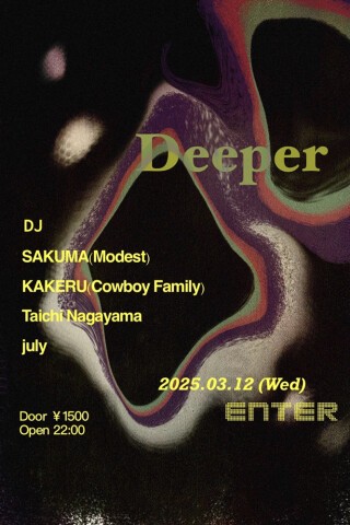julyが主催するDeeper。第2回目には2017年より始動し国内テクノシーンを牽引しているModestのオーガナイザーでありDJのSakuma、Cowboy FamilyのKAKERU、渋谷OathよりTaichi Nagayamaを招く。テクノ、ハウスを基調にミニマルなグルーヴの一夜。