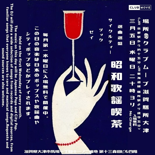 Held on the first Wednesday of every month, admission is free.The music on this day will be Japanese pop and city pop.