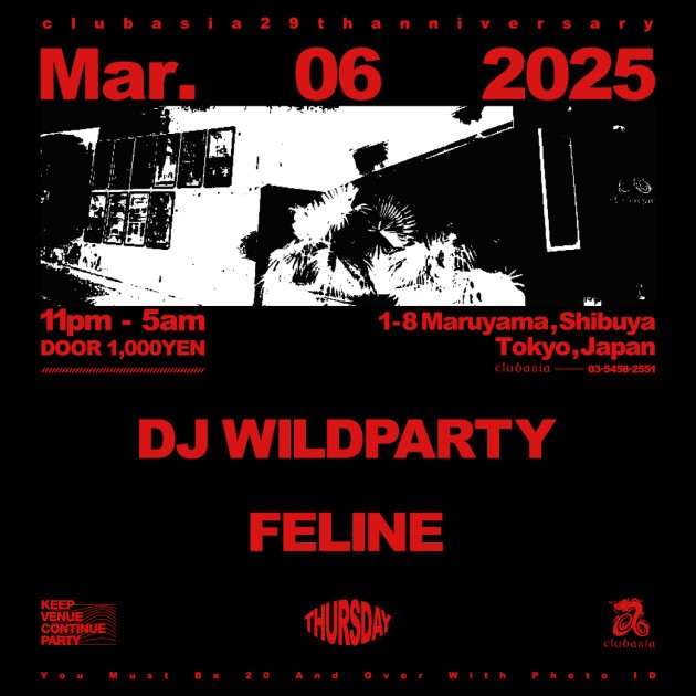 初回は多ジャンル多方面とウルトラ・ボーダーレスに活躍する "DJ WILDPARTY" との二人会がclubasia 29周年として開催決定。お見逃しなく!