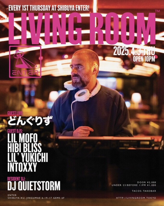 ヒップホップ/ハウス/ジャズに限らず、様々な手法で独自の音楽を提示し続けた真の音楽家であるDJ QUIETSTORM。彼だからこそ為し得ることのできる特別な一夜にはこれまで、平日のパーティにも関わらず様々なジャンルのトップDJ/アーティストだけでなく、これからの音楽を担う若いアーティストを招き、音楽を愛する多くの人々を魅了してきた。 代官山UNICE→渋谷contactを経て、渋谷ENTERではソファーに座ってのDJスタイルではないがダンスフロアー中央にブースが位置する新しいスタイルがLIVING ROOMのコンセプトにマッチし毎回素敵な空間となっている。