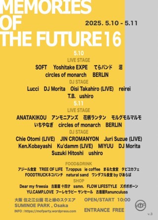 MEMORIES OF THE FUTUREはBERLIN・circle of the monarchが主催する野外フリーパーティーです。 2013年9月からスタートしました。 身近な自由な感じで。フリーキーにパーティーを。主催バンド含め、ジャム、アンビエント、ロック等のバンド、ちんどん楽団、そしてテクノ・ハウスDJが出演します。 ピクニックを、お酒を、踊りを、チルアウトをお楽しみください。 パーティーしましょう。